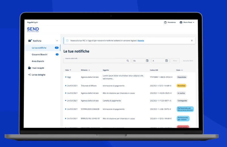 Il Servizio Notifiche Digitali semplifica la gestione delle comunicazioni a valore legale per enti, cittadini e imprese. Infatti, grazie a SEND (anche nota come Piattaforma Notifiche Digitali – PND - di cui all'art. 26 del decreto-legge 76/2020 s.m.i.) si possono ricevere istantaneamente le comunicazioni a valore legale da parte di un ente, visualizzarle, gestirle e pagarle direttamente online sulla piattaforma SEND o dall'app IO.