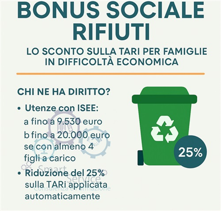Il bonus sociale rifiuti è un’agevolazione nazionale introdotta da ARERA (Autorità di Regolazione per Energia, Reti e Ambiente) per sostenere le famiglie in condizioni di disagio economico nel pagamento della tassa rifiuti (TARI) o della tariffa corrispettiva.